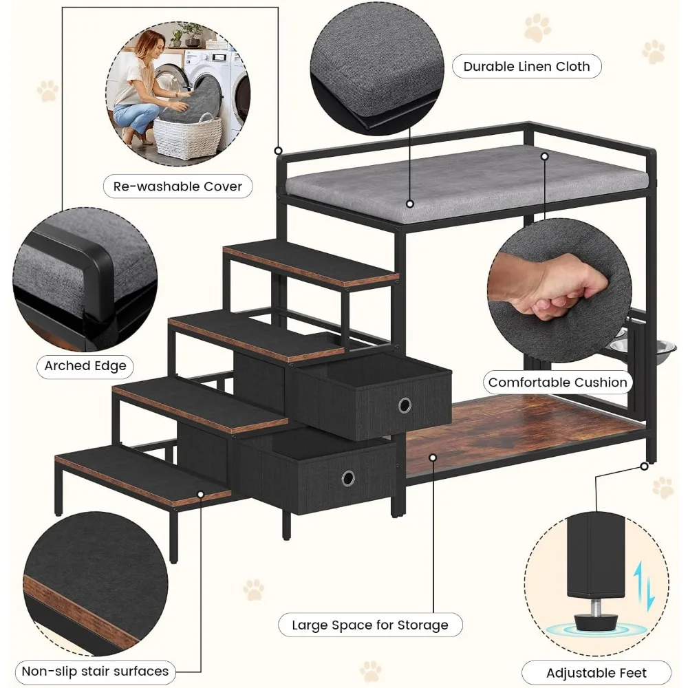 This dog window perch is designed to encourage interaction and alleviate pet anxiety by providing a comfortable spot near a window with a view. It allows pets to watch the outdoors and anticipate your return, reducing boredom and separation anxiety while keeping them engaged. The product features a removable 4-step pet stair with a lower step height for ease of access, making it suitable for older, smaller, or less mobile pets, including those with hip dysplasia. The stairs are covered in textured carpet for secure footing and comfort and can be used as a standalone step system. The window perch includes a 360° swivel feeder with a spring switch mechanism and four height adjustments, along with two 6.7″ stainless steel bowls for convenient eating and drinking. Its smart design offers a cozy top sleeping space with a cushion and a versatile bottom area, which can be used as a second pet sleeping nook or for toy storage, allowing two pets to enjoy the space at the same time. The stairs also include two spacious storage drawers. Constructed with a sturdy metal frame and high-quality wood grain engineered board, the dog window perch is built for lasting stability and can support pets up to 60 lbs. Its beautiful wood finish design complements most home decors, allowing it to blend seamlessly into any room, making it a great addition next to beds, couches, or chairs.