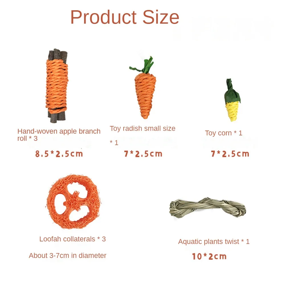 9 Pcs Rabbit Chew Toys: Rabbit toys set includes 3pcs Loofah, 3pcs Woven apple branch roll, 1pcs Water grass twists, 1pcs Carrot toy, 1pcs corn toy. Quality and fun molar toys carefully selected for your beloved pet!