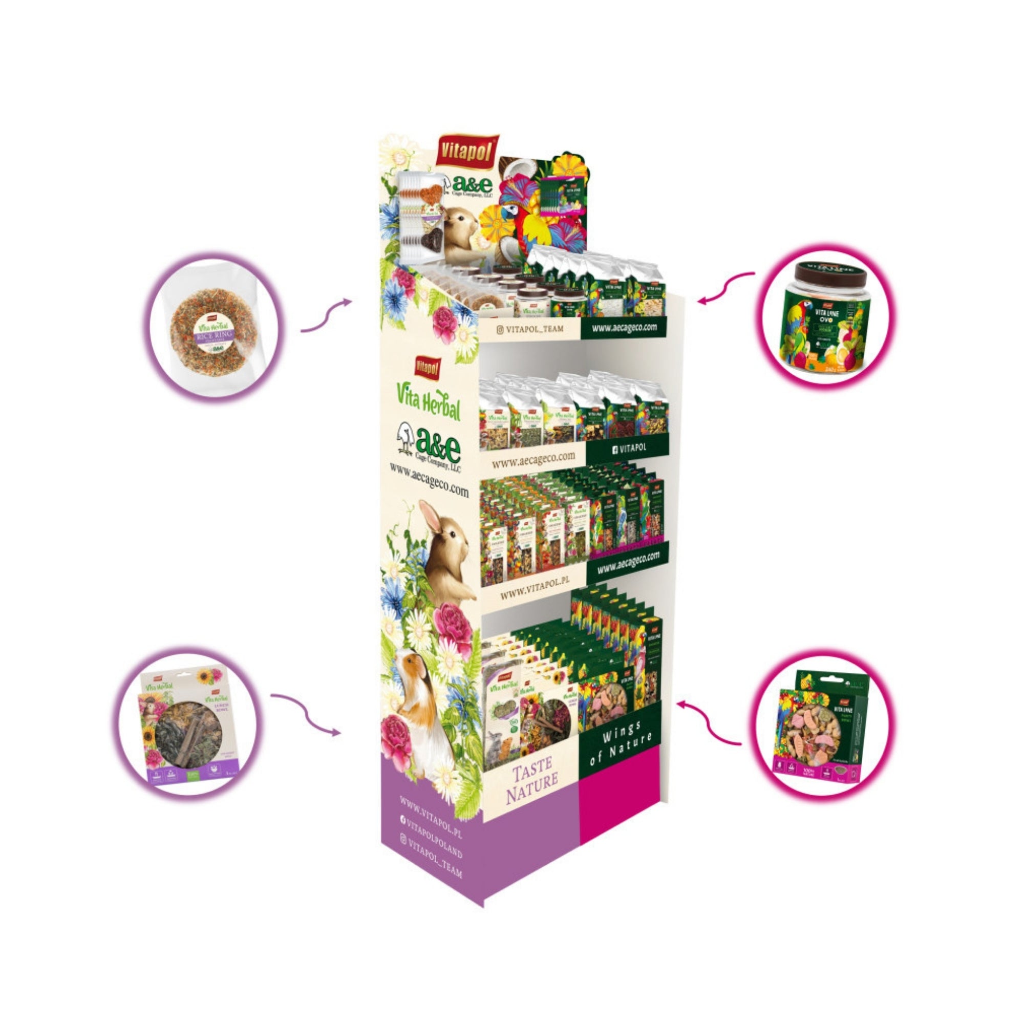 The Vita Herbal line consist of nutritious complementary snacks which enrich, rodents, rabbits and small animals’ everyday diet. The recipes are based solely on natural ingredients, such as vegetables, fruit, and herbs. The Vita Line, line, is supplemental feeds in the form of dietary supplements, but also bird snacks based on wild seeds. All compositions are rich in vitamins and minerals recommended for daily use for preventive purposes.