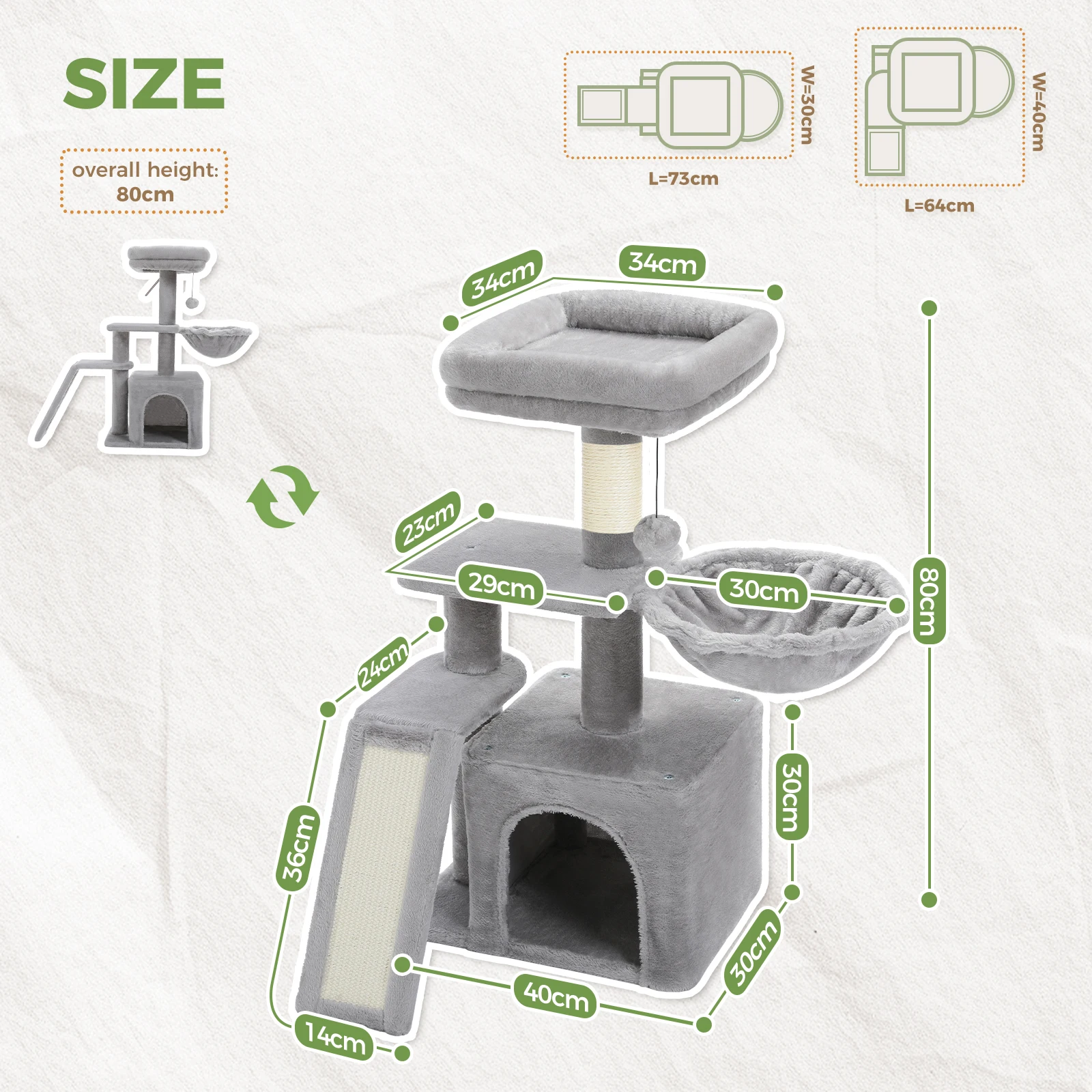 Multiple Scratchable Sections & Fun toys: The scratching post and pad covered by natural sisal can satisfy kitten's the natural needs of scratching as well as help your cats build up a good scratching habit. And the fluffy pompom brings more fun for your baby cats (with an extra replaceable pompom).