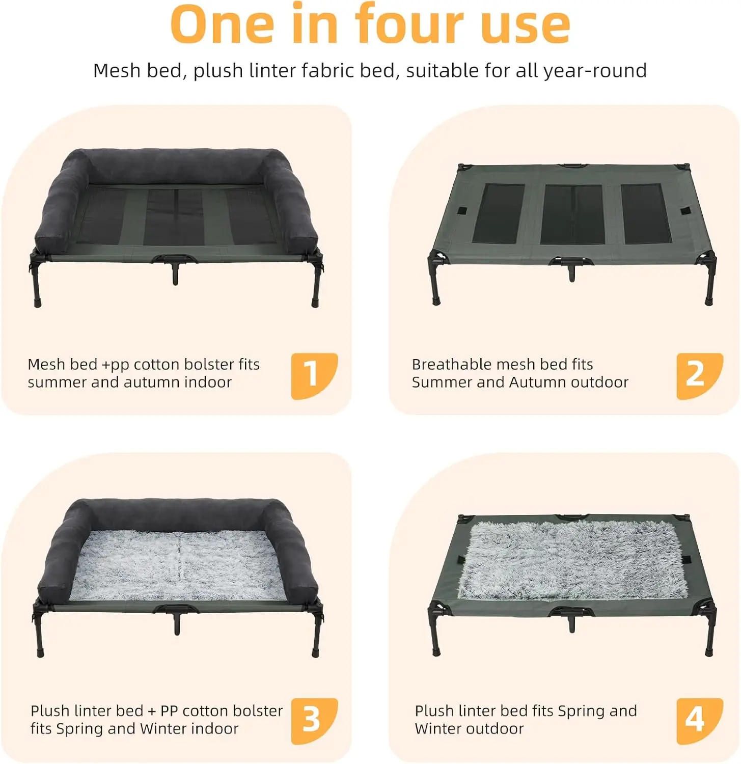 • Both Summer Mesh Raised Cot&Winter Warm Elevated Bed – The dog beds elevated outdoor has two pad to install,one is mesh pad which is perfect for hot summer season,and the other is fur pad,which is perfect for cold winter,both mat pad are easy to install,there has Velcro under both mat,so when you can change mat with season easily