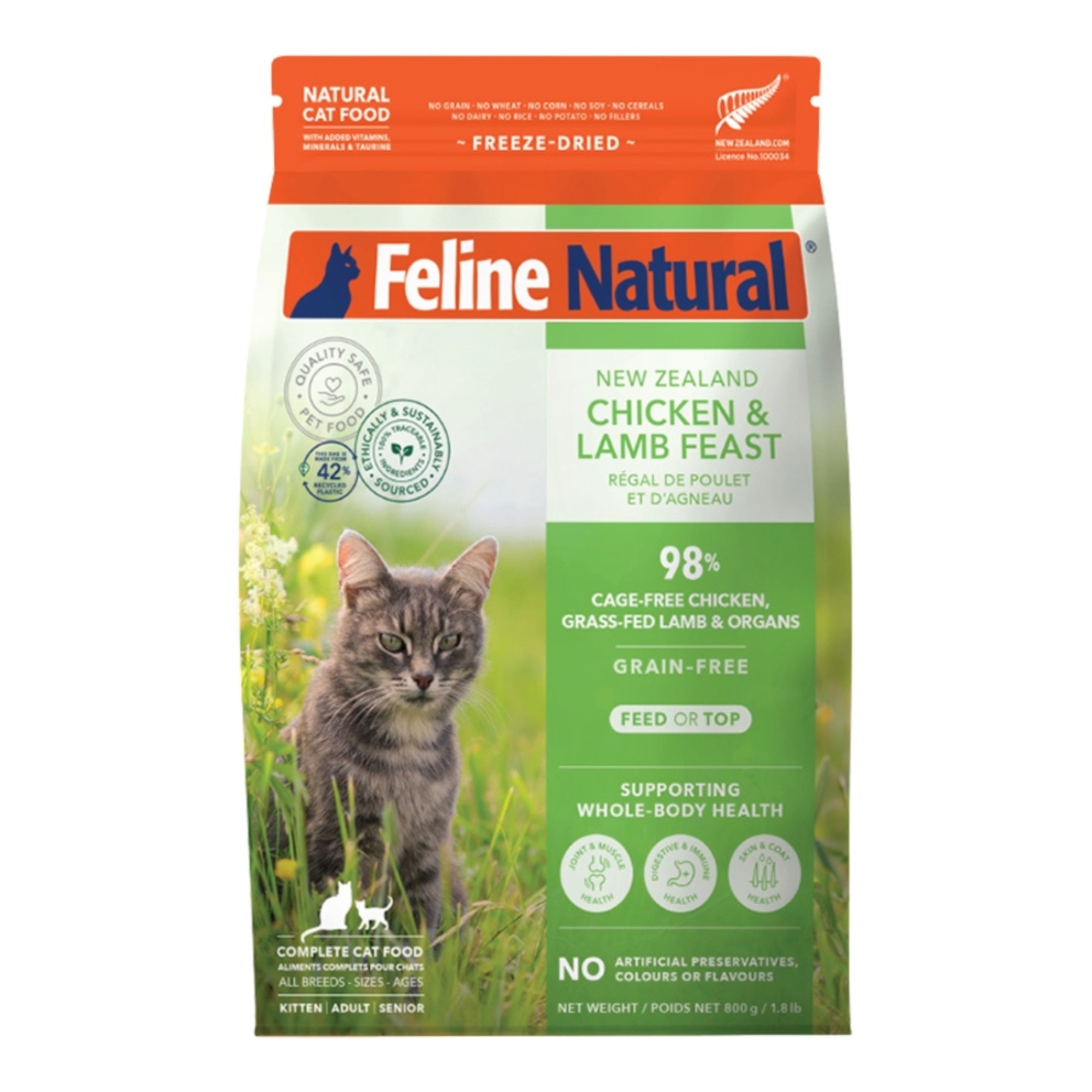 Our complete and balanced Freeze-Dried New Zealand Chicken & Lamb Feast contains 98% Cage-Free Chicken, Grass-Fed Lamb, and Organs with New Zealand Green Mussels, Kelp, Taurine, Flaxseed Flakes, Vitamins, and Minerals in support of your cat’s whole-body health.