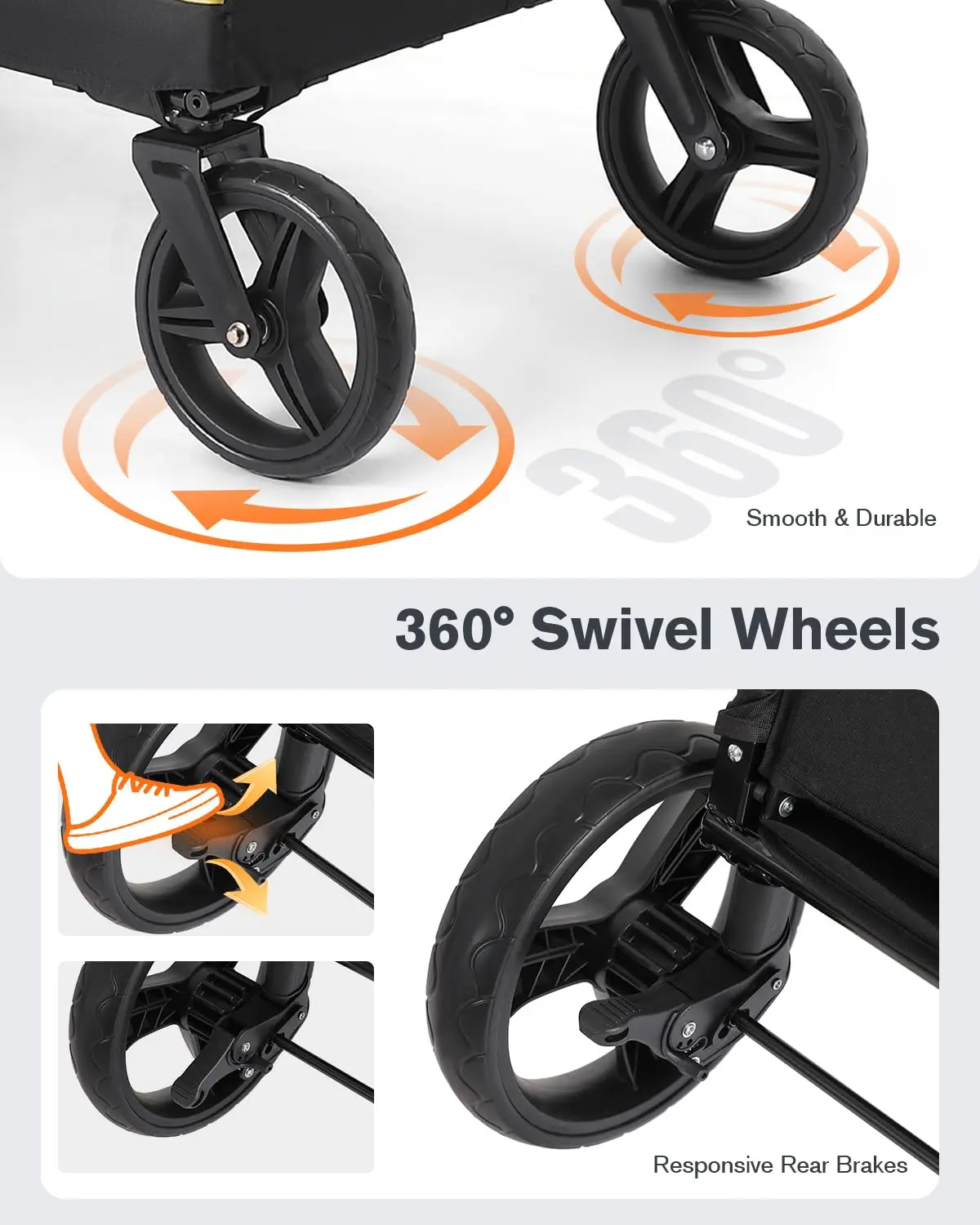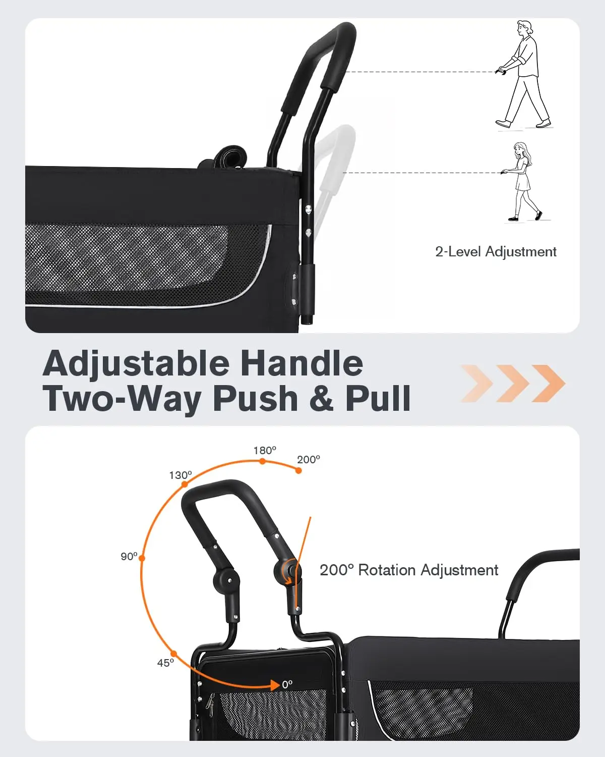 Introducing our versatile and durable all-terrain pet stroller designed to enhance your outdoor adventures with your furry friend. This foldable dog stroller is perfect for medium and large dogs, offering a comfortable and secure ride on various surfaces. Key Features: – **All-Terrain Performance**: Equipped with sturdy wheels that handle rough paths, grass, and sidewalks smoothly, ensuring a stable journey for your pet. – **Easy Access**: Features three convenient entrances—front, side, and rear—allowing quick entry and exit without hassle. – **Safety First**: Includes reliable brakes for secure parking on slopes or uneven ground, providing peace of mind during stops. – **Adjustable Comfort**: Dual handles are reversible and adjustable in height to suit different users, reducing strain while pushing. – **High Weight Capacity**: Supports pets up to 160 pounds (approximately 73 kilograms), making it ideal for larger breeds or multiple small pets. – **Compact Storage**: The stroller folds easily for transport or storage in cars or closets, saving space when not in use. Benefits: This pet stroller is crafted from high-quality materials to withstand daily use. It offers enhanced mobility for older or injured dogs who need assistance walking. The spacious interior ensures comfort during long outings. Perfect for trips to the park, vet visits, or shopping excursions. Easy assembly with clear instructions included. Regular cleaning recommended to maintain hygiene. Ideal For: Pet owners seeking a reliable solution for transporting their dogs safely outdoors. Suitable for urban walks or rural trails.