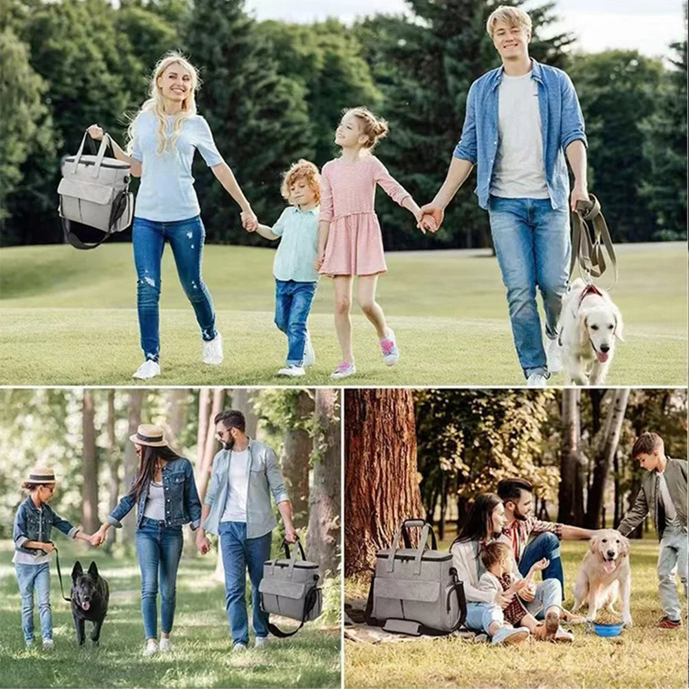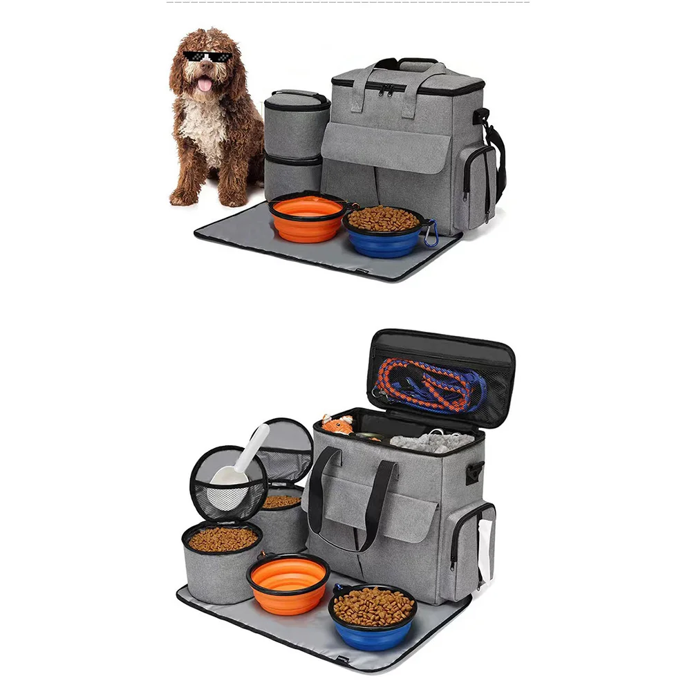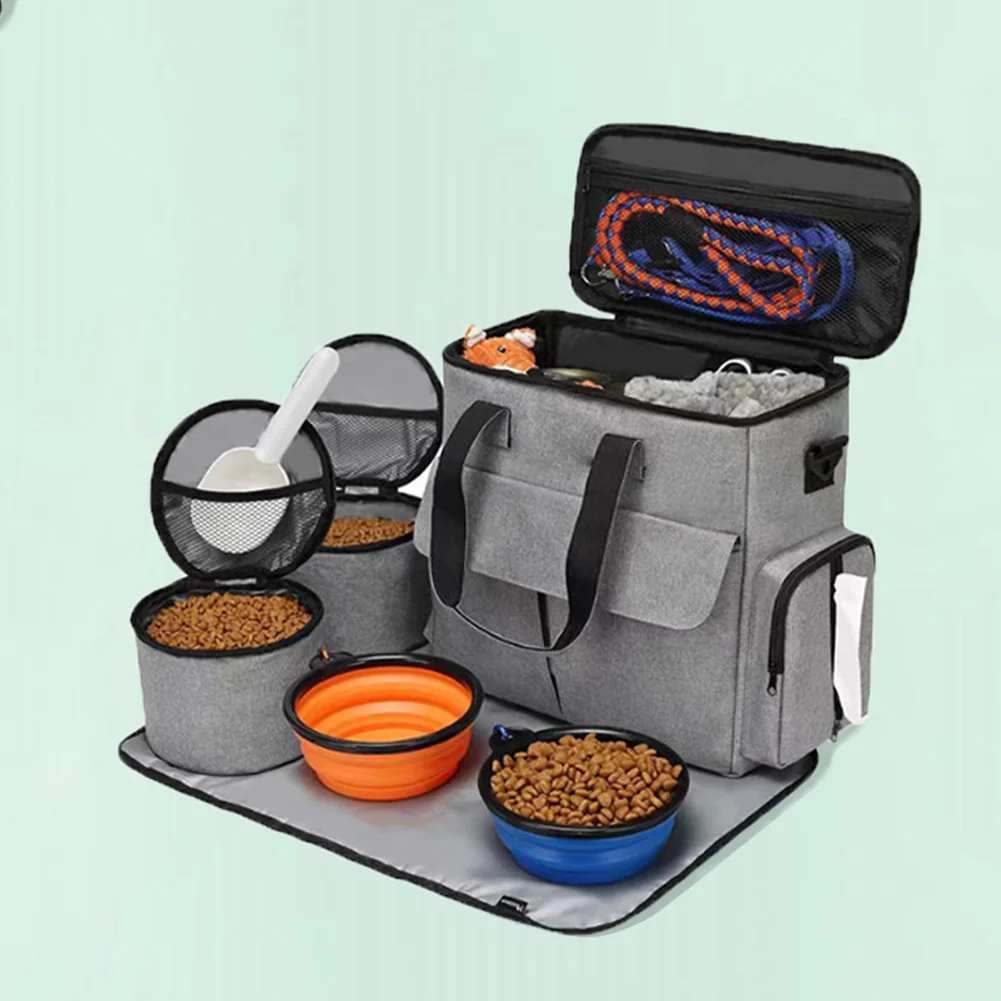 ⒋ Complete Travel Set: The dog travel bag set includes 1 stylish dog tote bag, 2 dog food bags, 1 waterproof placemat, and 2 collapsible silicone pet bowls, providing all the necessities for your adventures.