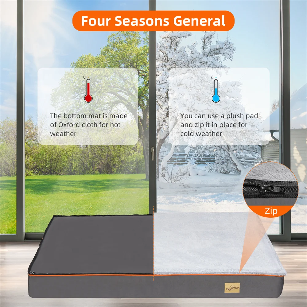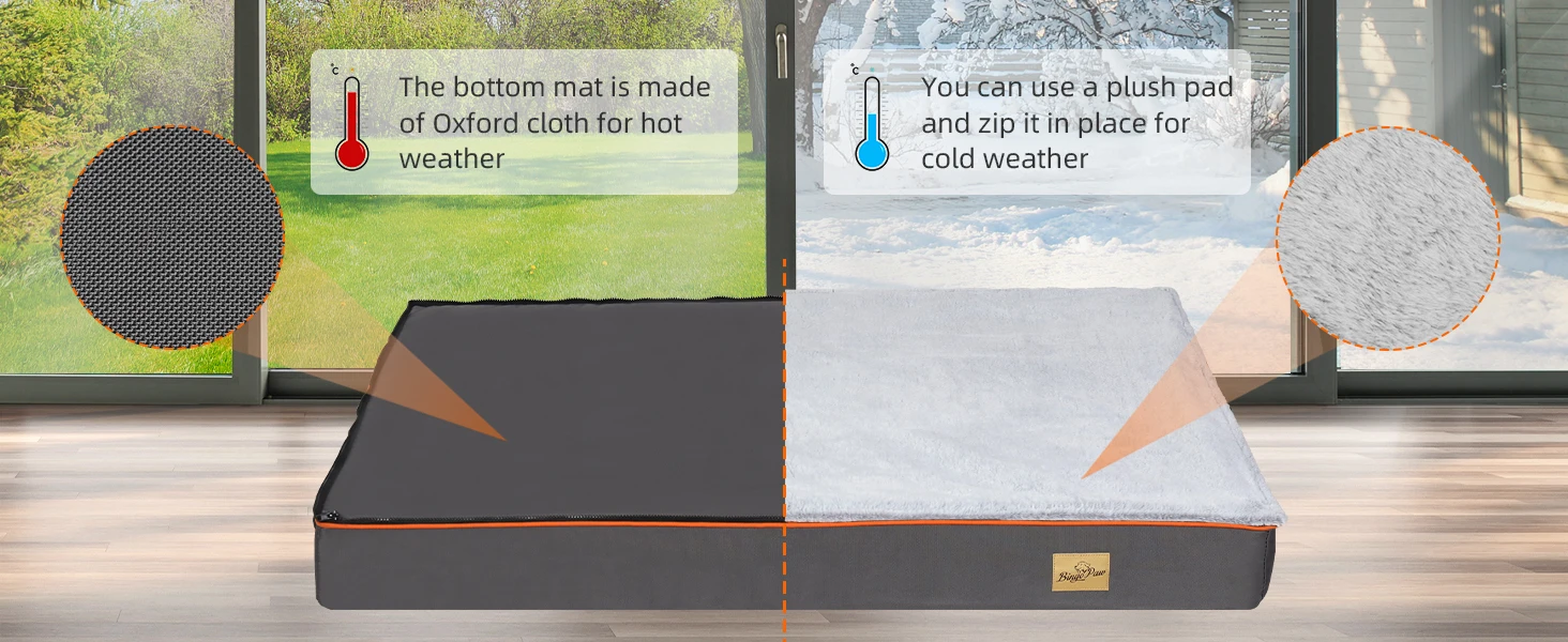 Summer & Winter Dog Beds Combination – The large dog bed sofa combined with luxury soft linter fabric cover and scratch proof oxford fabric cover together via zip, you can remove the plush cover quickly in hot summer days, In the cold winter, You can change the bed with a warm plush mat on it, Just means buy one BingoPaw bed, like you got two pet bed from us, and we sell bed covers only in our store, if you need to buy more covers to replace, it is easy to do it