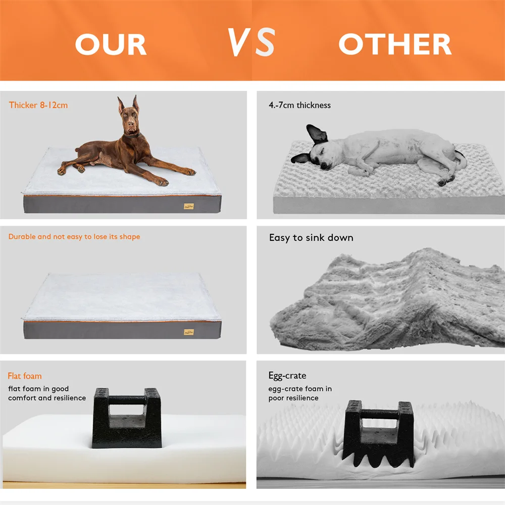Thicken Orthopedic Memory Foam – 8-12cm thicken flat foam not egg crate foam, human-grade dog bed can support large dog without severe collapse, Filled with pressure-relieving orthopedic foam that release joint pain and improves a pet’s health and mobility, Orthopedic memory foam supports joints and muscles, relieves pressure points, and improves circulation (especially beneficial for older dogs and larger breeds)