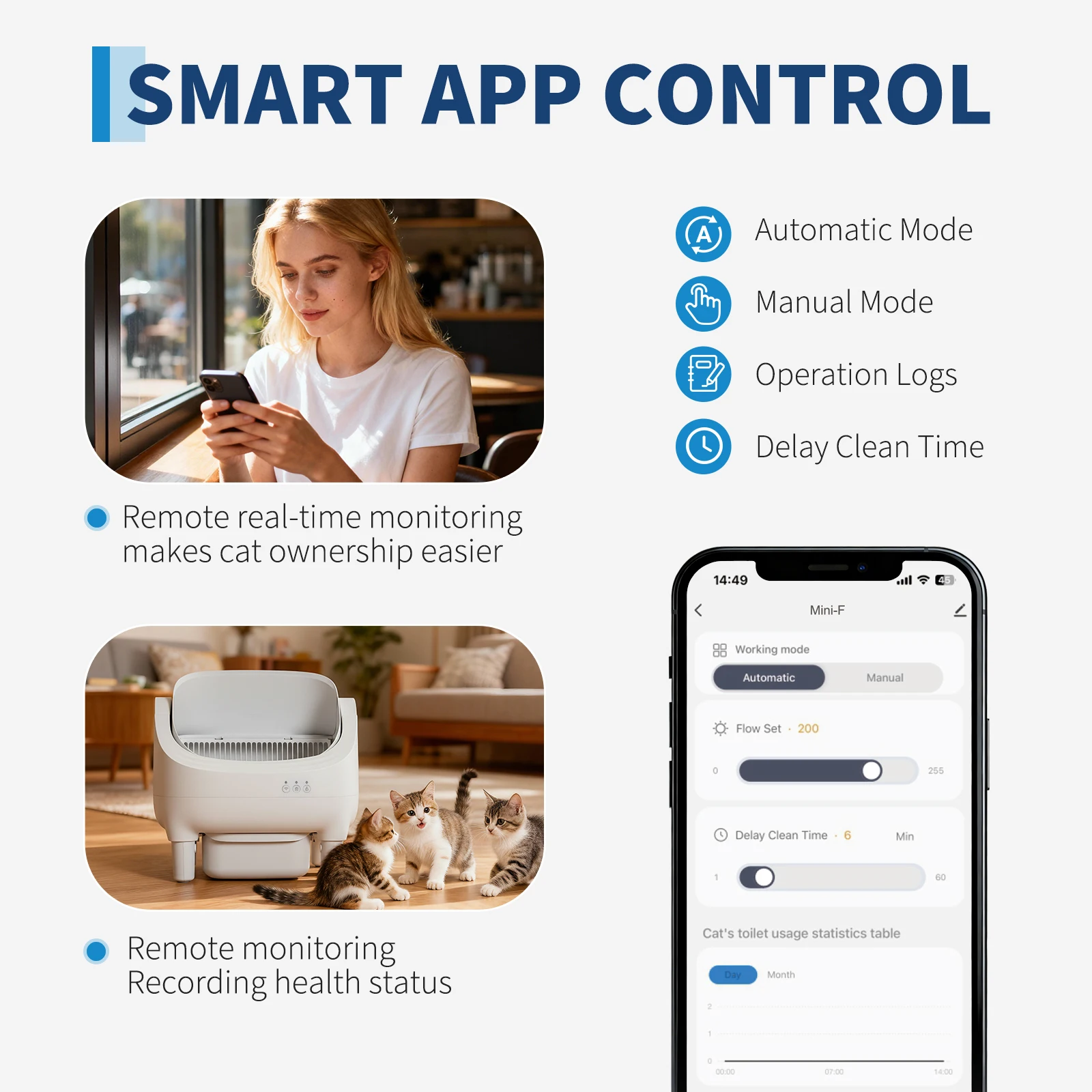 Smart APP Control: WiFi remote control, real-time alerts, and health tracking to monitor your cat’s well-being.