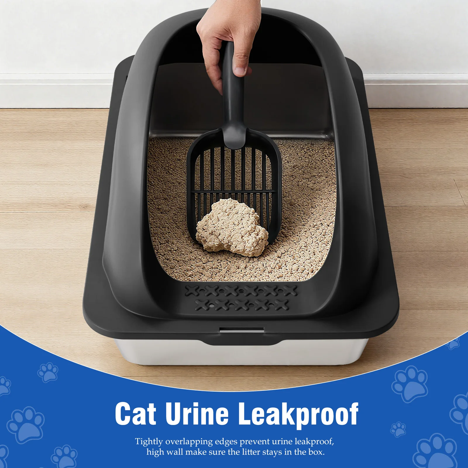 Perfect Combination: Cat litter box stainless steel at the entrance of the litter box effectively filters litter from your cat's claws, keeping floors clean and saving litter. Side litter scoop and wall-mounted scoop holder make it easy to thoroughly clean the litter box.