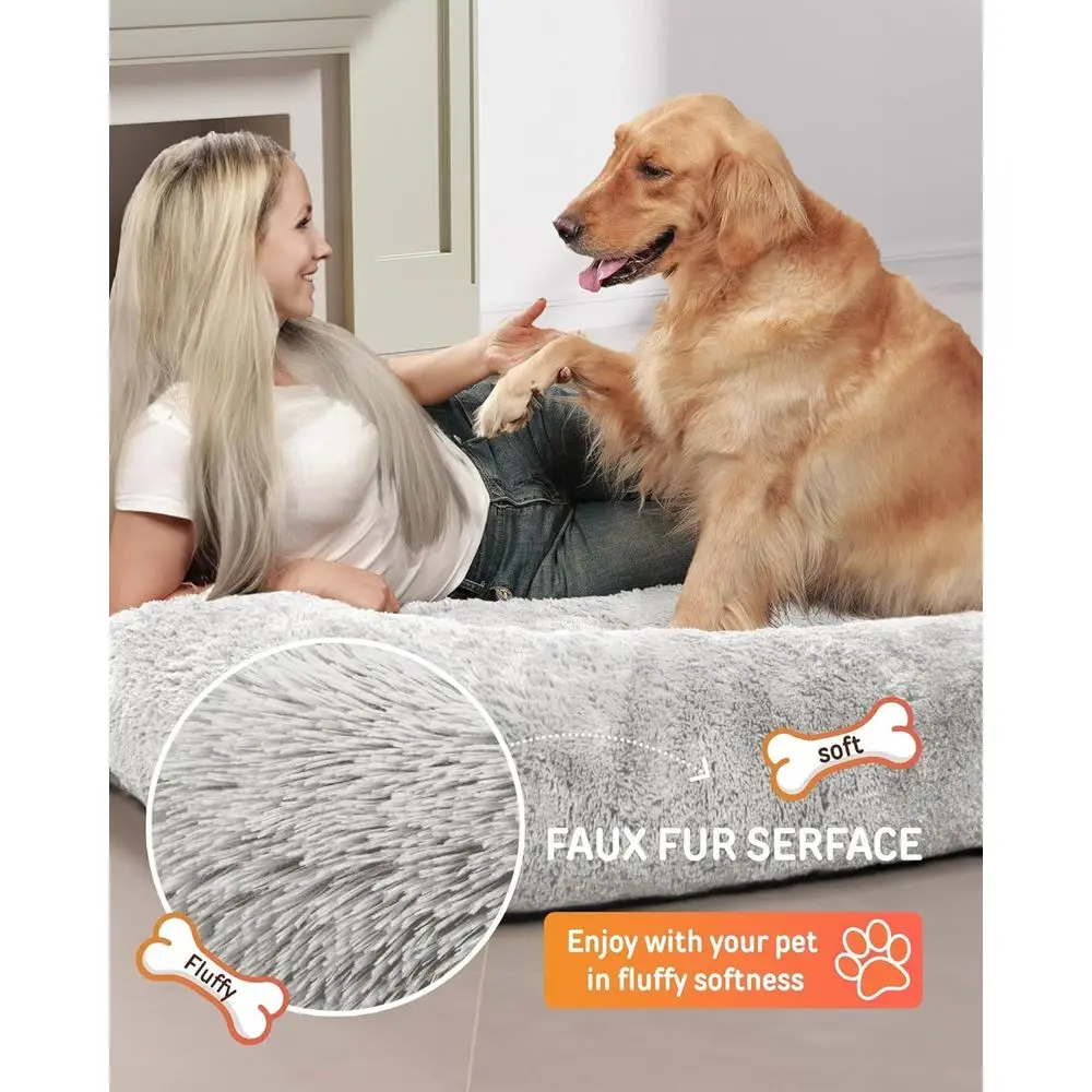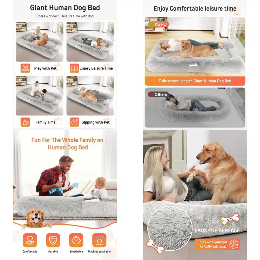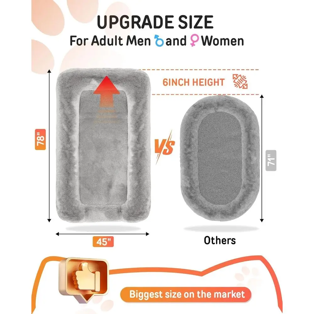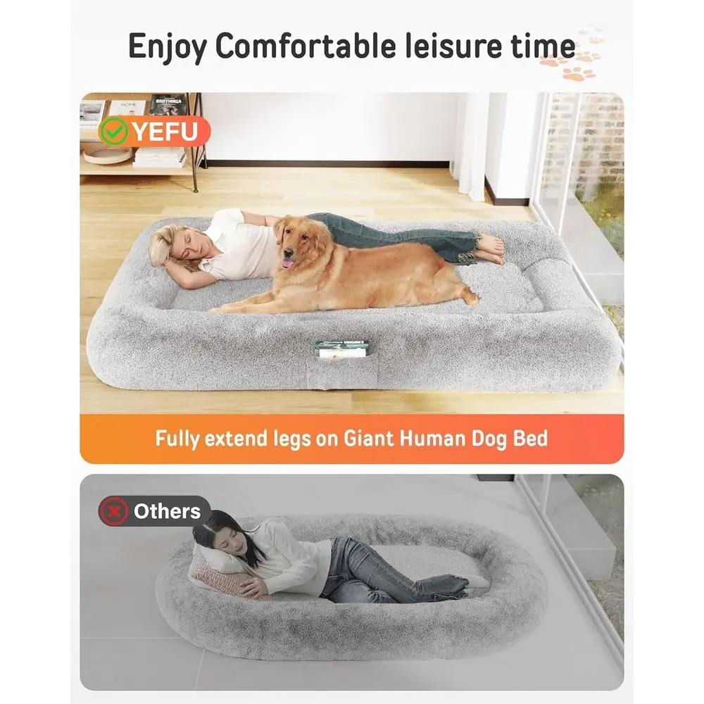 This extra large dog bed, measuring 79x45x12, offers a comfortable space for adults and pets to relax or nap together. The spacious design allows for full leg extension, providing a cozy and luxurious experience akin to the comfort of a mother’s embrace. The fluffy faux fur and rich foam of this human-sized dog bed make it an ideal spot for rest and play, suitable for both people and kids.