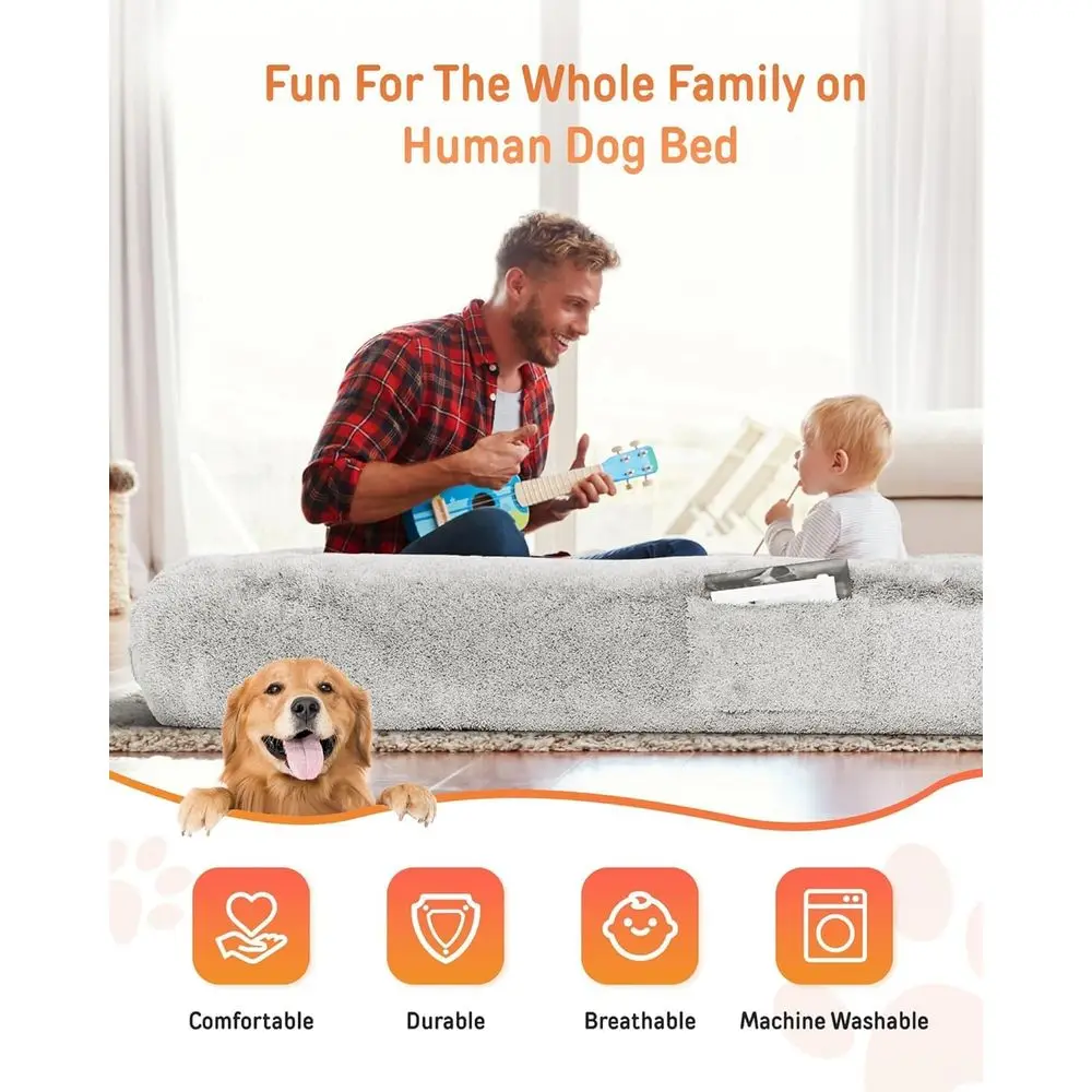 Designed for those with sensory and special needs, this large dog bed can help alleviate anxiety by providing a comforting space with furry friends. The bed’s anti-slip rubber particles ensure stability, making it perfect for companionship, children, and pets. The cozy human-sized dog bed offers a better-than-bed experience for relaxation or play, allowing the whole family to enjoy it together.