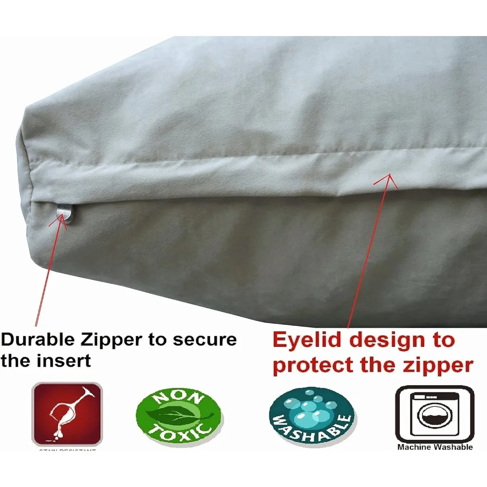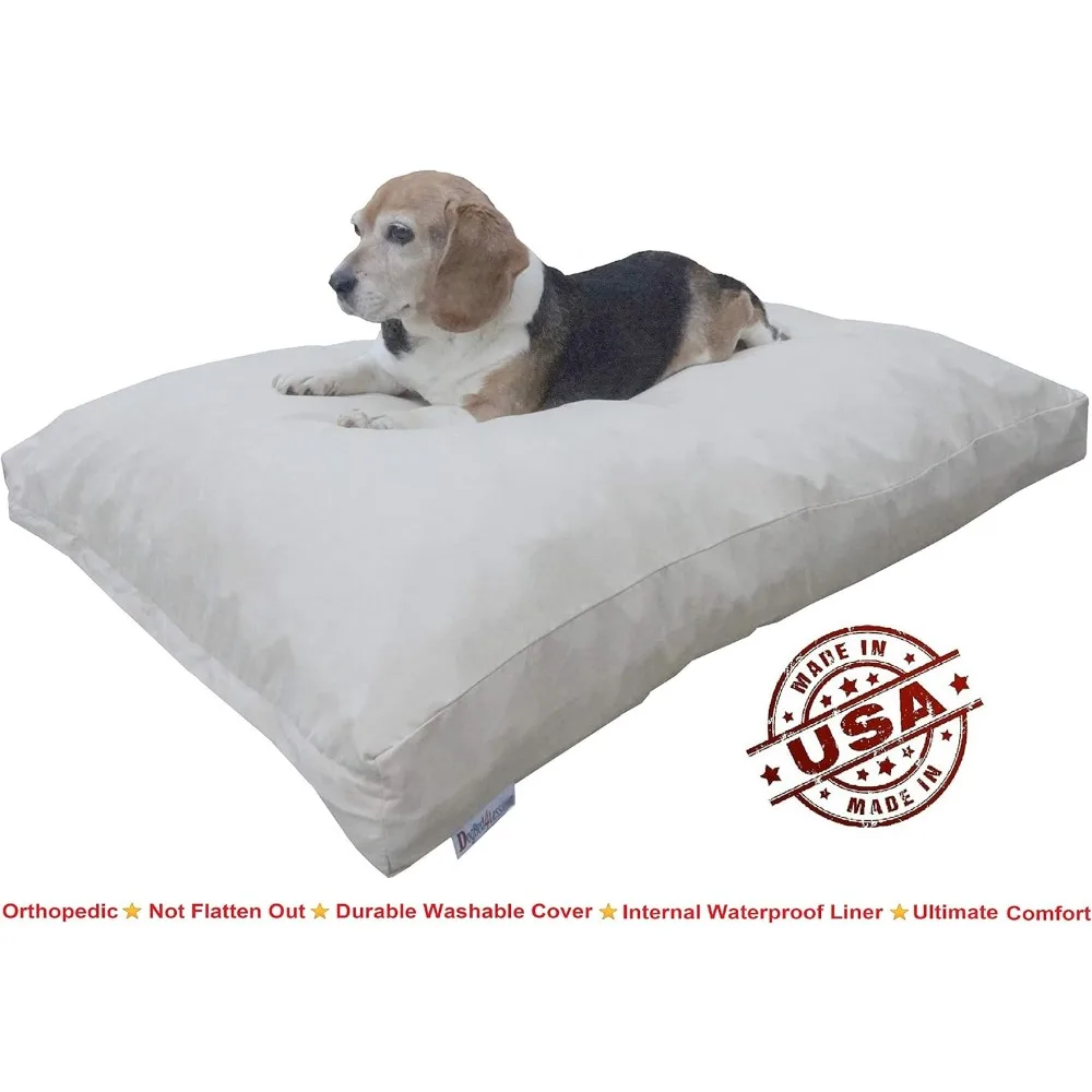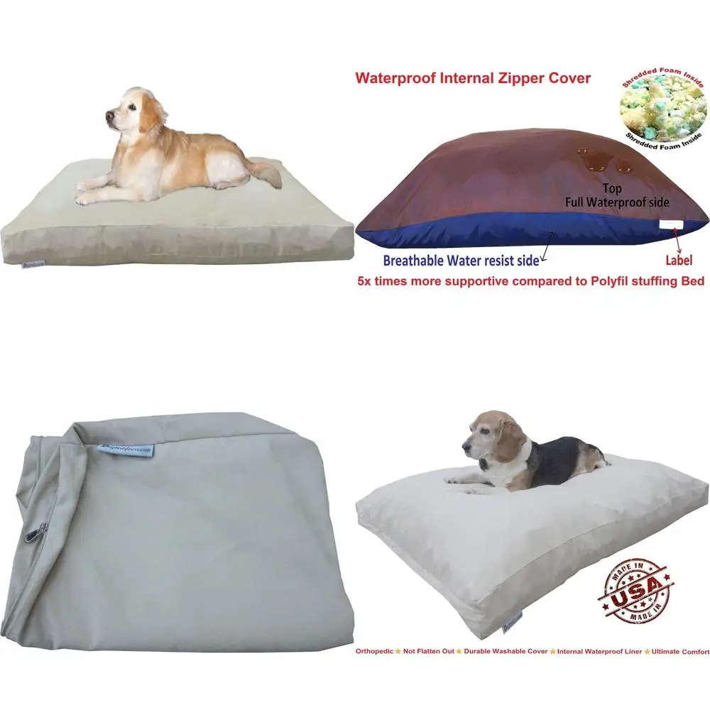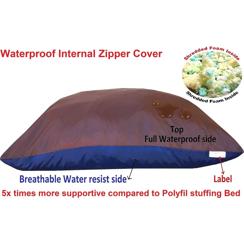 This product features an extra-large pillow bed for pets, measuring 55 inches by 37 inches, and is handmade in the USA using top-quality shredded memory foam. It combines premium poly-fill and shredded polyurethane foam to offer maximum resiliency and support, ensuring comfort for your pet. The bed is designed with two layers of strong covers: a breathable waterproof internal layer to secure the filling and a durable external cover made of 200gsm thick suede microfiber fabric in khaki color, which is both stain and wrinkle resistant. The external cover is machine washable and dryable, and it has extra stitching to enhance its durability. The bed also includes a removable, washable zipper cover that is water-resistant on one side and waterproof on the other, allowing for air circulation. The 8-inch thick overstuffed insert provides orthopedic comfort and support for larger dogs up to 140 lbs, with a mix of shredded memory foam that promotes better airflow and a cool, breathable sleeping surface. This pillow bed is five times denser and heavier than other poly-fill stuffed beds, ensuring it won’t flatten over time. Made with premium materials and smart features, this luxury dog pillow offers superior durability and comfort, aligning the body properly to relieve achy joints, arthritis, and hip dysplasia.